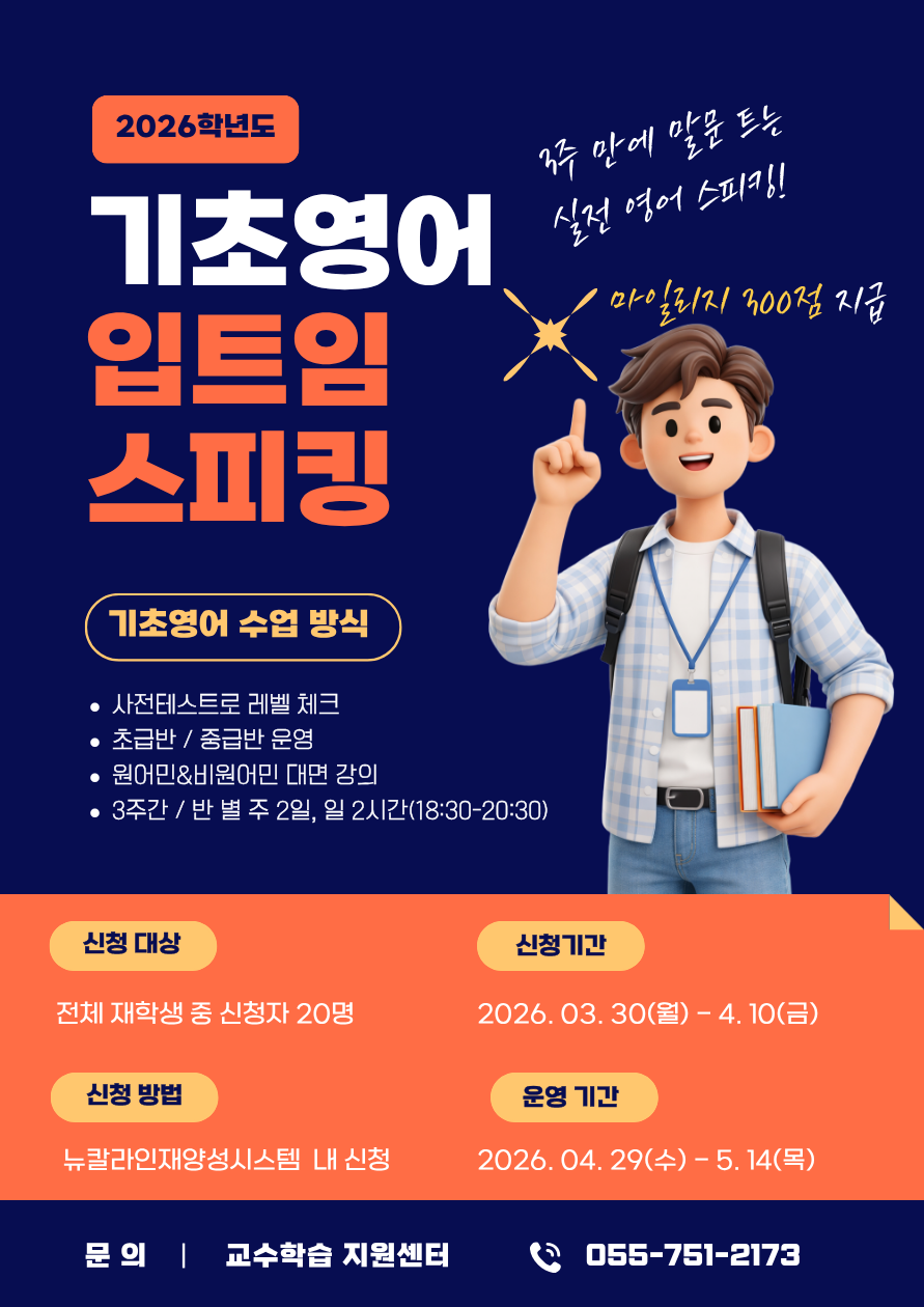 '26학년도 기초영어 비교과프로그램 「입트임 스피킹」을 운영하고자 하오니, 학생들은 적극 참여 바랍니다.